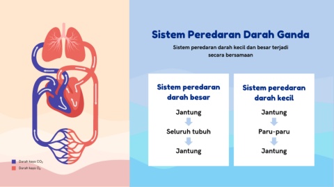 Sistem Peredaran Darah Ganda Sistem peredaran darah kecil dan besar terjadi secara bersamaan Sistem peredaran Sistem peredaran darah besar darah kecil Jantung Jantung Seluruh tubuh Paru-paru Jantung Jantung Darah kaya CO₂ Darah kaya O₂