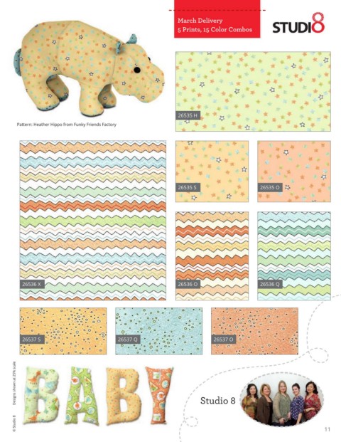 March Delivery 5 Prints, 15 Color Combos 26535 H Pattern: Heather Hippo from Funky Friends Factory 26535 S 26535 O 26536 X 26536 O 26536 Q 26537 S 26537 Q 26537 O © Studio 8 Designs shown at 25% scale Studio 8 11