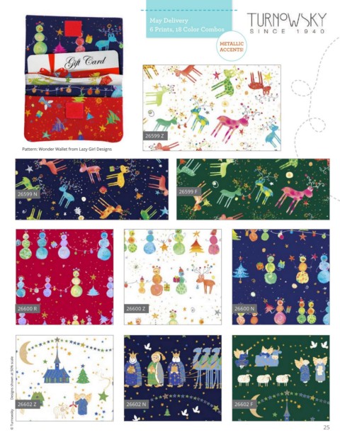 May Delivery 6 Prints, 18 Color Combos METALLIC ACCENTS! 26599 Z Pattern: Wonder Wallet from Lazy Girl Designs 26599 N 26599 F 26600 R 26600 Z 26600 N © Turnowsky Designs shown at 50% scale 26602 Z 26602 N 26602 F 25