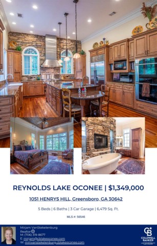 REYNOLDS LAKE OCONEE | $1,349,000 1051 HENRYS HILL, Greensboro, GA 30642 5 Beds | 6 Baths | 3 Car Garage | 6,479 Sq. Ft. MLS #: 56546 Mirjam VanStekelenburg Realtor M: (706) 319-8677 E: mirjam@cblakeoconee.com W: mmvanstekelenburg.cblakeoconee.com