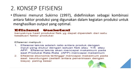2. KONSEP EFISIENSI • Efisiensi menurut Sukirno (1997), didefinisikan sebagai kombinasi antara faktor produksi yang digunakan dalam kegiatan produksi untuk menghasilkan output yang optimal.