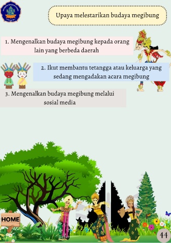 Upaya melestarikan budaya megibung 1. Mengenalkan budaya megibung kepada orang lain yang berbeda daerah 2. Ikut membantu tetangga atau keluarga yang sedang mengadakan acara megibung 3. Mengenalkan budaya megibung melalui sosial media 44