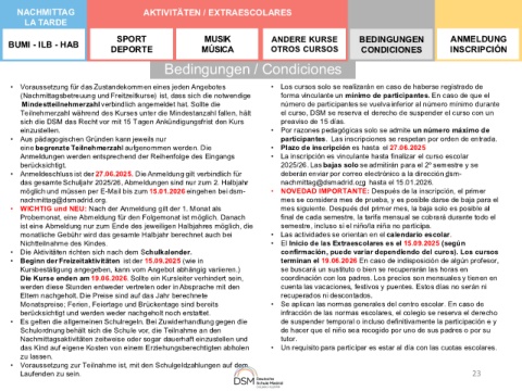 (Nachmittagsbetreuung und Freitzeitkurse) ist, dass sich die notwendige forma vinculante un mínimo de participantes. En caso de que el