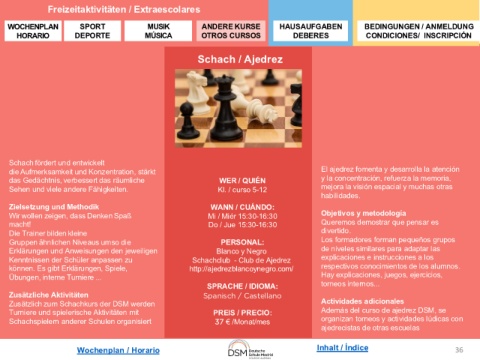 Turniere und spielerische Aktivitäten mit PREIS / PRECIO: Además del curso de ajedrez DSM, se
