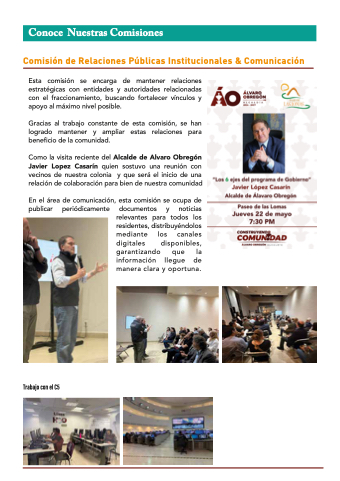 Esta comisión se encarga de mantener relaciones estratégicas con entidades y autoridades relacionadas con el fraccionamiento, buscando fortalecer vínculos y apoyo al máximo nivel posible.