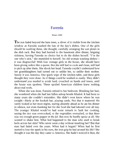 window as Fareeda washed the last of the day’s dishes. One of the girls