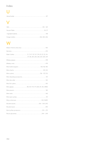 Whiskey glasses...............................................................................................................378 Whiskey rocks ..................................................................................................................379 Wine bottle stoppers ..................................................................................145, 162, 182 Wine charms............................................................................................................145, 163 Wine coolers................................................................................................ 136 – 137, 153 Wine decanting accessories.........................................................................................161 Wine drip collar ................................................................................................................162 Wine foil cutters..............................................................................................................160 Wine glasses.................................................166, 167, 170, 171, 308, 311, 313, 318KK Wine pourers................................................................................................................... 182 Wine racks ......................................................................................................................... 164 Wine saver pumps............................................................................................................161 Wing corkscrews..............................................................................................160, 164EE Wooden boards......................................................................................202 – 203, 205 Wooden bowls ................................................................................................................ 295 Work surface protectors................................................................................274 – 275 Woven placemats.............................................................................................244 – 249