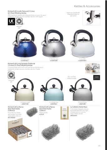 Coloured bodies with a soft touch and flip up whistling spout. Suitable for all heat sources including induction. Display boxed.