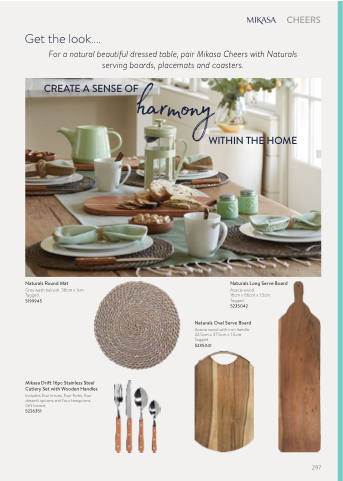 For a natural beautiful dressed table, pair Mikasa Cheers with Naturals serving boards, placemats and coasters.