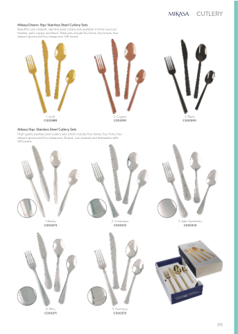 Beautiful rust-resistant, stainless steel cutlery sets available in three luxurious finishes; gold, copper and black. These sets include four forks, four knives, four dessert spoons and four teaspoons. Gift boxed.