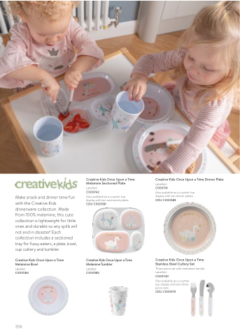 Make snack and dinner time fun with the Creative Kids dinnerware collection. Made from 100% melamine, this cute collection is lightweight for little ones and durable so any spills will not end in disaster! Each collection includes a sectioned tray for fussy eaters, a plate, bowl, cup cutlery and tumbler.