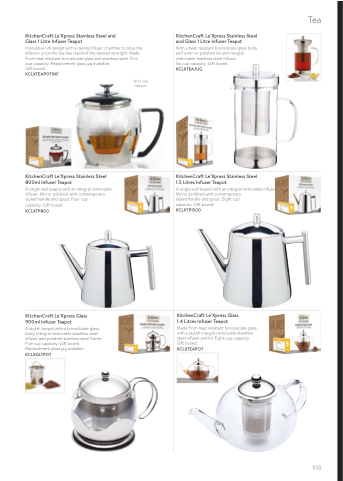 A stylish teapot with a borosilicate glass body, integral removable stainless steel infuser and polished stainless steel frame. Five cup capacity. Gift boxed. Replacement glass jug available. KCLXGLTPOT