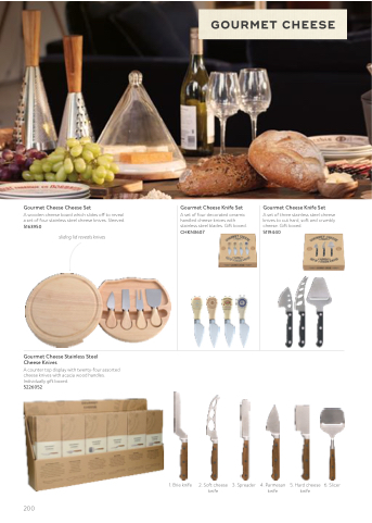 A counter top display with twenty-four assorted cheese knives with acacia wood handles. Individually gift boxed.
