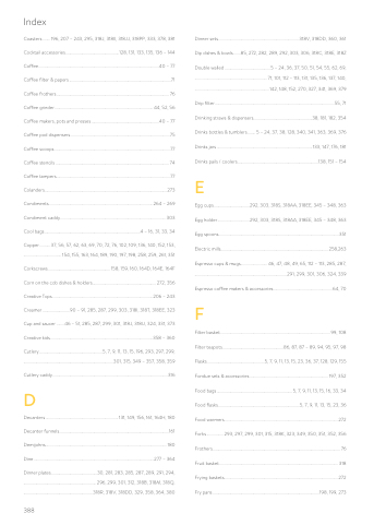 Filter basket .............................................................................................................. 99, 108 Filter teapots.............................................................86, 87, 87 – 89, 94, 95, 97, 98 Flasks .........................................................5, 7, 9, 11, 13, 15, 23, 36, 37, 128, 129, 155 Fondue sets & accessories ............................................................................... 197, 352 Food bags............................................................................5, 7, 9, 11, 13, 15, 16, 33, 34 Food flasks ................................................................................. 5, 7, 9, 11, 13, 15, 23, 36 Food warmers..................................................................................................................272 Forks ................. 293, 297, 299, 301, 315, 318K, 323, 349, 350, 351, 352, 356 Frothers................................................................................................................................ 76 Fruit basket ....................................................................................................................... 318 Frying baskets..................................................................................................................272 Fry pans ........................................................................................................... 198, 199, 273