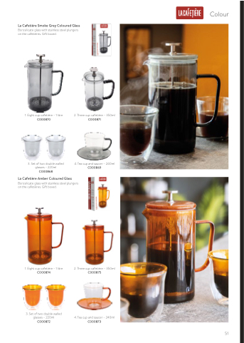 Borosilicate glass with stainless steel plungers on the cafetières. Gift boxed.