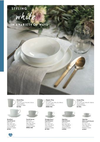 Cup & Saucer Bone China 6.8”x6.8”x3.5” (175x175x90mm) 16.2 fl oz (480ml) Packed in 4. Labels BC040
