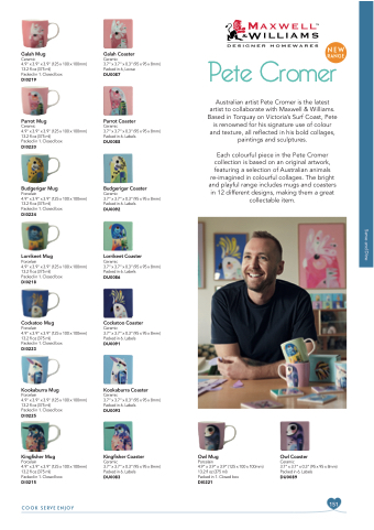 Each colourful piece in the Pete Cromer collection is based on an original artwork, featuring a selection of Australian animals re-imagined in colourful collages. The bright and playful range includes mugs and coasters in 12 different designs, making them a great collectable item.
