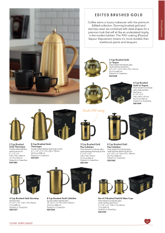 Coffee earns a luxury makeover with the premium Edited collection. Stunning brushed gold and stainless steel are combined with sleek shapes for a premium look that will sit like an understated trophy in the modern kitchen. The PVD coating (Physical Vapour Deposition) means it's more durable than traditional paints and lacquers.