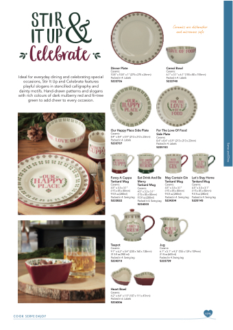 Ideal for everyday dining and celebrating special occasions, Stir It Up and Celebrate features playful slogans in stencilled calligraphy and dainty motifs. Hand-drawn patterns and slogans with rich colours of dark mulberry red and fir-tree green to add cheer to every occasion.