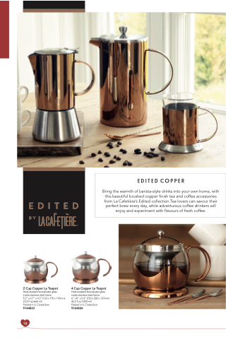 Bring the warmth of barista-style drinks into your own home, with this beautiful brushed copper finish tea and coffee accessories from La Cafetière’s Edited collection.Tea lovers can savour their perfect brew every day, while adventurous coffee drinkers will enjoy and experiment with flavours of fresh coffee.