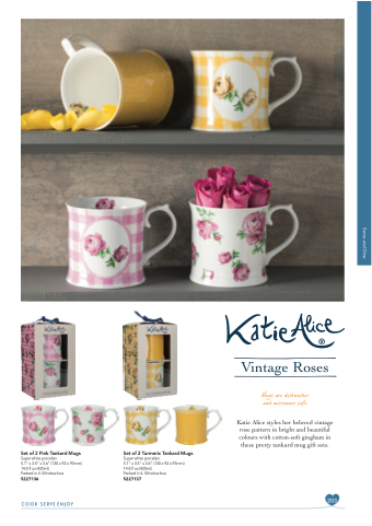 Katie Alice styles her beloved vintage rose pattern in bright and beautiful colours with cotton-soft gingham in these pretty tankard mug gift sets.