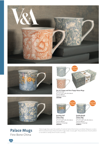 These mugs draw upon the wealth of material held at the Victoria and Albert Museum, London. With illustrated boxes these beautiful mugs make a luxury gift. The provenance of each pattern is included to satisfy the art lover’s curiosity.