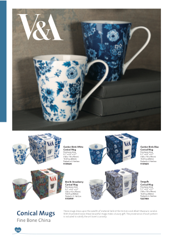 These mugs draw upon the wealth of material held at the Victoria and Albert Museum, London. With illustrated boxes these beautiful mugs make a luxury gift. The provenance of each pattern is included to satisfy the art lover’s curiosity.