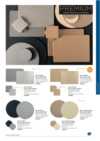 Set of 4 Cream/Taupe Faux Leather Mats Reversible, with stitching 11.4” x 11.4” (290 x 290mm) Packed in 6. Swing tag tied with leather ribbon C000270