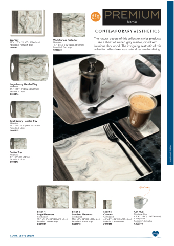 The natural beauty of this collection styles products like a sheet of swirled grey marble joined with luxurious dark wood. The intriguing aesthetic of this collection offers luxurious natural texture for dining.