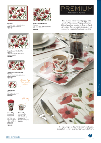 The lightweight and durable melamine trays in this collection have a contemporary matte finish.