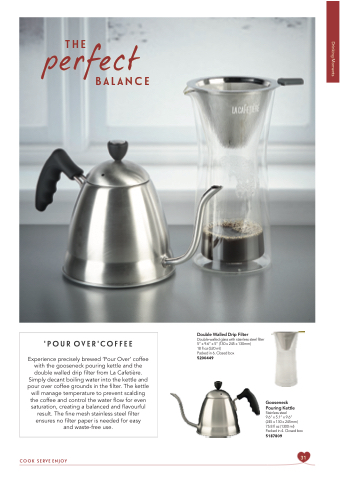 Experience precisely brewed ‘Pour Over’ coffee with the gooseneck pouring kettle and the double walled drip filter from La Cafetière. Simply decant boiling water into the kettle and pour over coffee grounds in the filter. The kettle will manage temperature to prevent scalding the coffee and control the water flow for even saturation, creating a balanced and flavourful result. The fine mesh stainless steel filter ensures no filter paper is needed for easy and waste-free use.