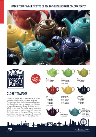 The spout position on these teapots has been developed over years to prevent any dripping or leaks, likewise the lids are designed not to fall off as you pour. The globe teapot provides a debris-free pour every time, due to the ceramic filter in the base of the spout. Flower petal tea, larger loose-leaf tea and teabags will reach their full flavour potential in these iconic teapots.