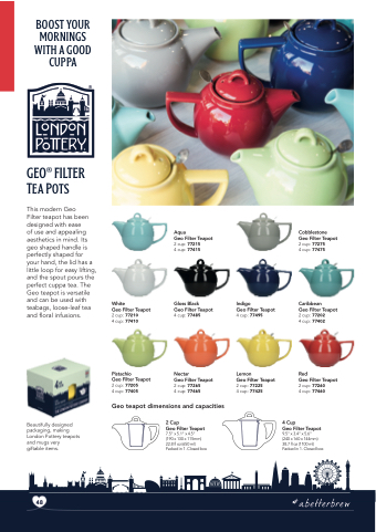 of use and appealing aesthetics in mind. Its geo shaped handle is perfectly shaped for your hand, the lid has a little loop for easy lifting, and the spout pours the perfect cuppa tea. The Geo teapot is versatile and can be used with teabags, loose-leaf tea and floral infusions.