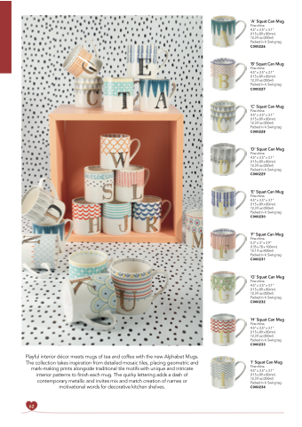 Playful interior décor meets mugs of tea and coffee with the new Alphabet Mugs. The collection takes inspiration from detailed mosaic tiles, placing geometric and mark-making prints alongside traditional tile motifs with unique and intricate interior patterns to finish each mug. The quirky lettering adds a dash of contemporary metallic and invites mix and match creation of names or motivational words for decorative kitchen shelves.