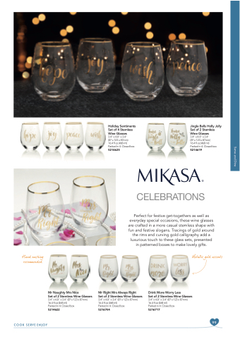 Perfect for festive get-togethers as well as everyday special occasions, these wine glasses are crafted in a more casual stemless shape with fun and festive slogans. Tracings of gold around the rims and curving gold calligraphy add a luxurious touch to these glass sets, presented in patterned boxes to make lovely gifts.