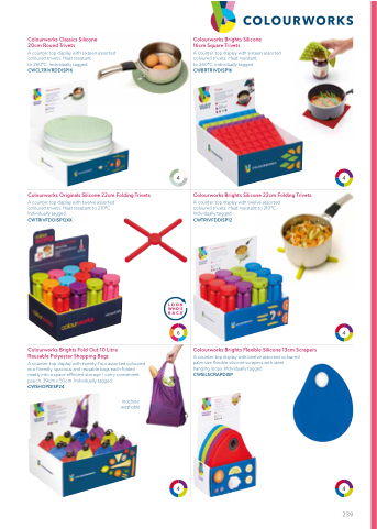 A counter top display with twelve assorted coloured trivets. Heat resistant to 210°C. Individually tagged.