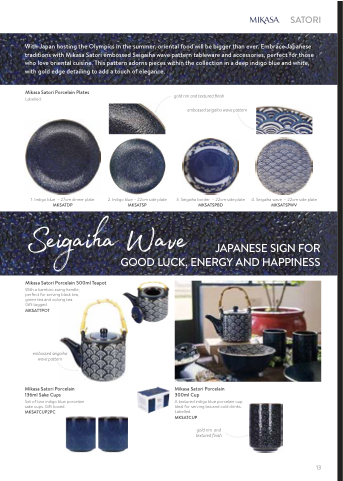 With Japan hosting the Olympics in the summer, oriental food will be bigger than ever. Embrace Japanese traditions with Mikasa Satori embossed Seigaiha wave pattern tableware and accessories, perfect for those who love oriental cuisine. This pattern adorns pieces within the collection in a deep indigo blue and white, with gold edge detailing to add a touch of elegance.