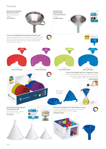 A counter top display with twenty-four assorted coloured 11cm funnels. Each collapses flat for easy storage. Heat resistant to 220°C. Individually tagged. CWFUNDISP24