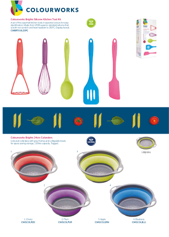 A set of five essential kitchen tools in assorted colours for easy identification. Made from LFGB superior standard silicone that is both non-scratch and heat resistant to 260°C. Display boxed. CWBRTOOLS5PC