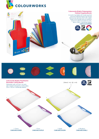 A counter top display with twelve assorted coloured chopping boards. Each board features twin grooves which with a slight tweak of the handle twist up creating a channel to slide food easily into pans. 35cm x 25cm. Individually tagged. CWFOLDCHOPDISP