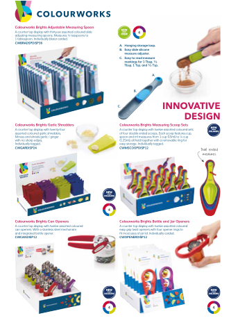 A counter top display with twelve assorted coloured sets of four double ended scoops. Each scoop features cup, spoon and ml measures from 1 cup (15ml) to 1⁄4 cup (1.25ml), all held together with a removable ring for easy storage. Individually tagged. CWMSCOOPDISP12