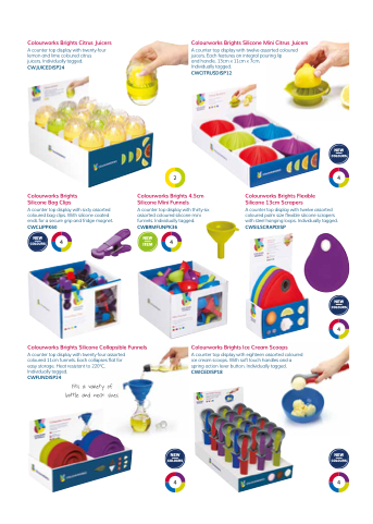 A counter top display with twenty-four assorted coloured 11cm funnels. Each collapses flat for easy storage. Heat resistant to 220°C. Individually tagged.
