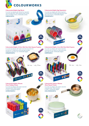 A counter top display with twelve assorted coloured mini non-stick fry / blinis pans with easy grip handles. Individually tagged. CWFRYDISP12