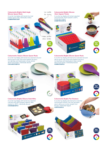 A counter top display with twenty-four assorted coloured silicone spoon rests. Each heat resistant rest has a non-slip base and raised grips to keep utensils
