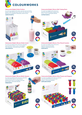 A counter top display with twelve assorted coloured drinks frothers. With stainless steel rods and coils. Requires 2 x AA batteries (not supplied). Individually acetate boxed. CWFROTHDISP12