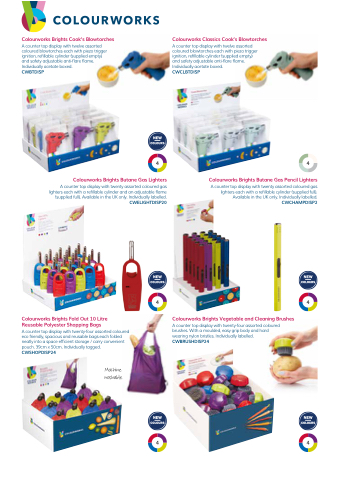 A counter top display with twelve assorted coloured blowtorches each with piezo trigger ignition, refillable cylinder (supplied empty) and safety adjustable anti-flare flame. Individually acetate boxed.