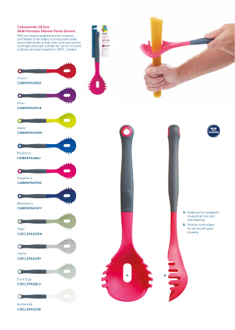 soft flexible comb edges to scoop pasta easily and a wide profile to help drain and serve penne, conchiglie and fusilli. Suitable for use on non-stick surfaces and heat resistant to 260°C. Carded.