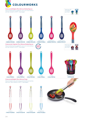 Silicone slotted spoons suitable for use on non-stick surfaces and heat resistant to 260°C. Hang tagged.