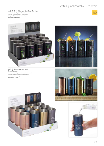 A counter top display with twelve assorted tumblers. Each with a brushed metallic finish and etched slogan. BCMUGMETDISP12