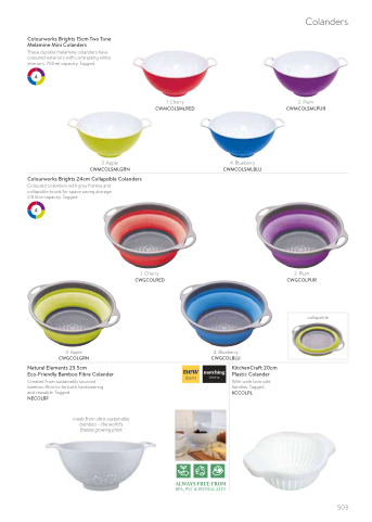 Coloured colanders with grey frames and collapsible bowls for space saving storage. 2.8 litre capacity. Tagged.